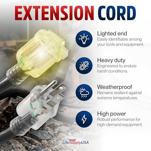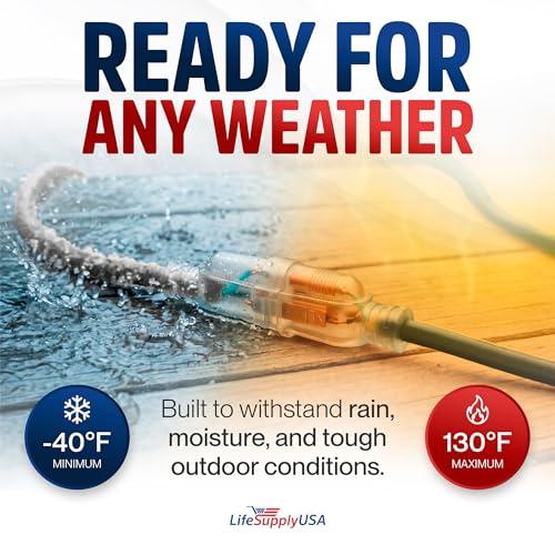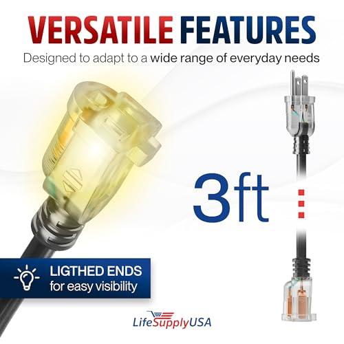 Looking for a rugged and reliable power extension cord that can stand up to the elements? Look no further than the LifeSupplyUSA Power Extension Cord! This heavy duty cord is designed for both outdoor and indoor use, and can withstand extreme temperatures without cracking or deteriorating. The tough vinyl jacket is resistant to oil, grease, moisture and abrasion, making it perfect for tough jobsites or messy projects. The lighted end indicates when the power is on, so you can work with confidence knowing that your tools are ready to go. With a 15 amp, 125 volt rating, this extension cord can handle a variety of power needs. Don’t be caught without the right cord for the job – grab a LifeSupplyUSA Power Extension Cord and be prepared for anything!