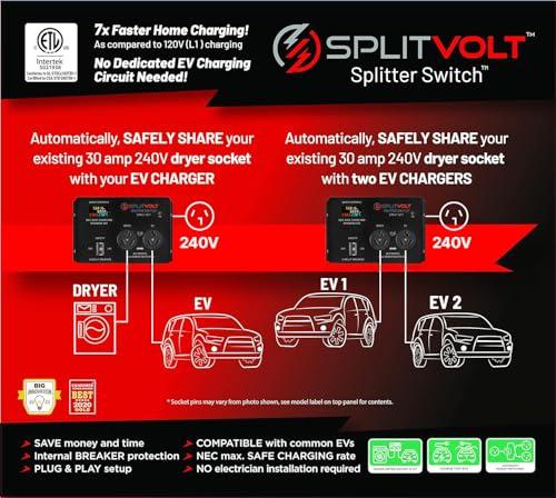 Splitvolt 24 Amp Splitter Switch: Take your EV charging to the next level without breaking the bank. With cETLus certified power splitter, share your household power with a Level 2 EV Charger instantly. No need for a new circuit – use your existing 220v – 240v dryer socket and save on installation costs. This model perfectly fits NEMA 10-30 plugs, ensuring compatibility with your equipment. Experience safe, fast, and hassle-free home charging today.